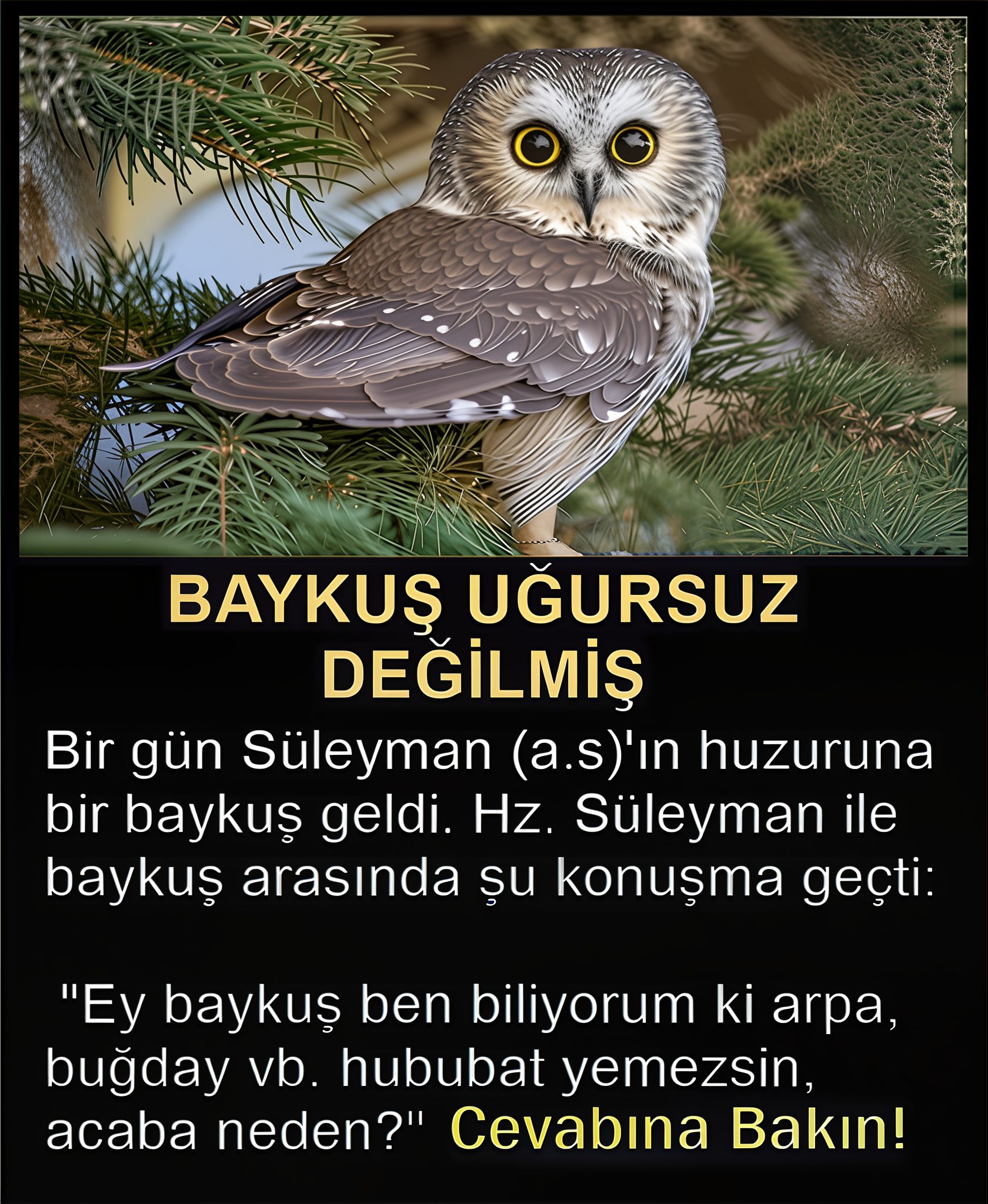 Baykuş asla yalan söylemez. O yüzden batılda uğursuz sayılımıştır. Bir baykuş, Süleyman Aleyhisselâm’ın yanına geldi, selâm verdi. Hz. Süleyman (a.s) selâmını aldı. Sonra aralarında şöyle konuşma geçti: “Ey baykuş, neden topraktan çıkanları yemezsin?” “Çünkü Hz. Âdem (a.s) topraktan çıkan şey sebebiyle cennetten çıkarıldı.” “Peki, neden su içmezsin?” “Çünkü Nûh Aleyhisselâmın kavmi suda boğuldu.” “Neden imar edilmiş yerleri terk edip harabelerde yaşıyorsun?” “Harabeler Hz. Allah’ın (c.c) mirasıdır, ben de Hz. Allah’ın (c.c) mirasında otururum.”